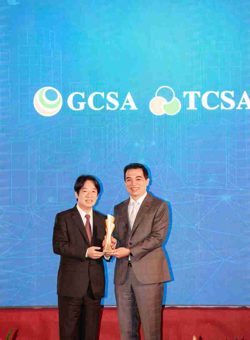 达全方位永续表现获全球永续奖及台湾永续奖肯定,,由副总统赖清德颁奖 (左),,,,赏金国际总经理柯富仁 (右) 代表领奖
