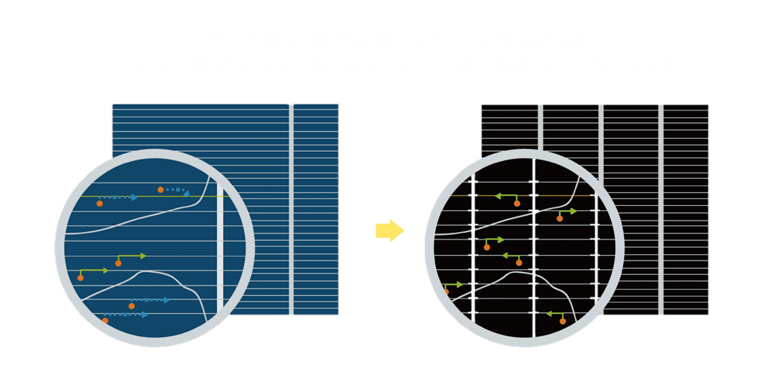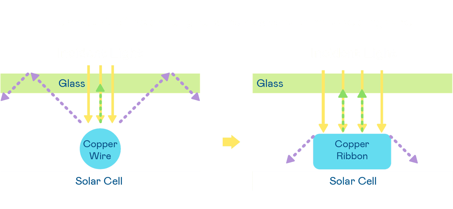 - 电池使用多条铜导线 (Copper wire) 于电池片上形成较短的电流路径,,,,提高电流收集效率,,,采用圆形设计的铜导线较传统扁平式的铜焊带 (Ribbon),,,可增加入射至电池的光线量。。