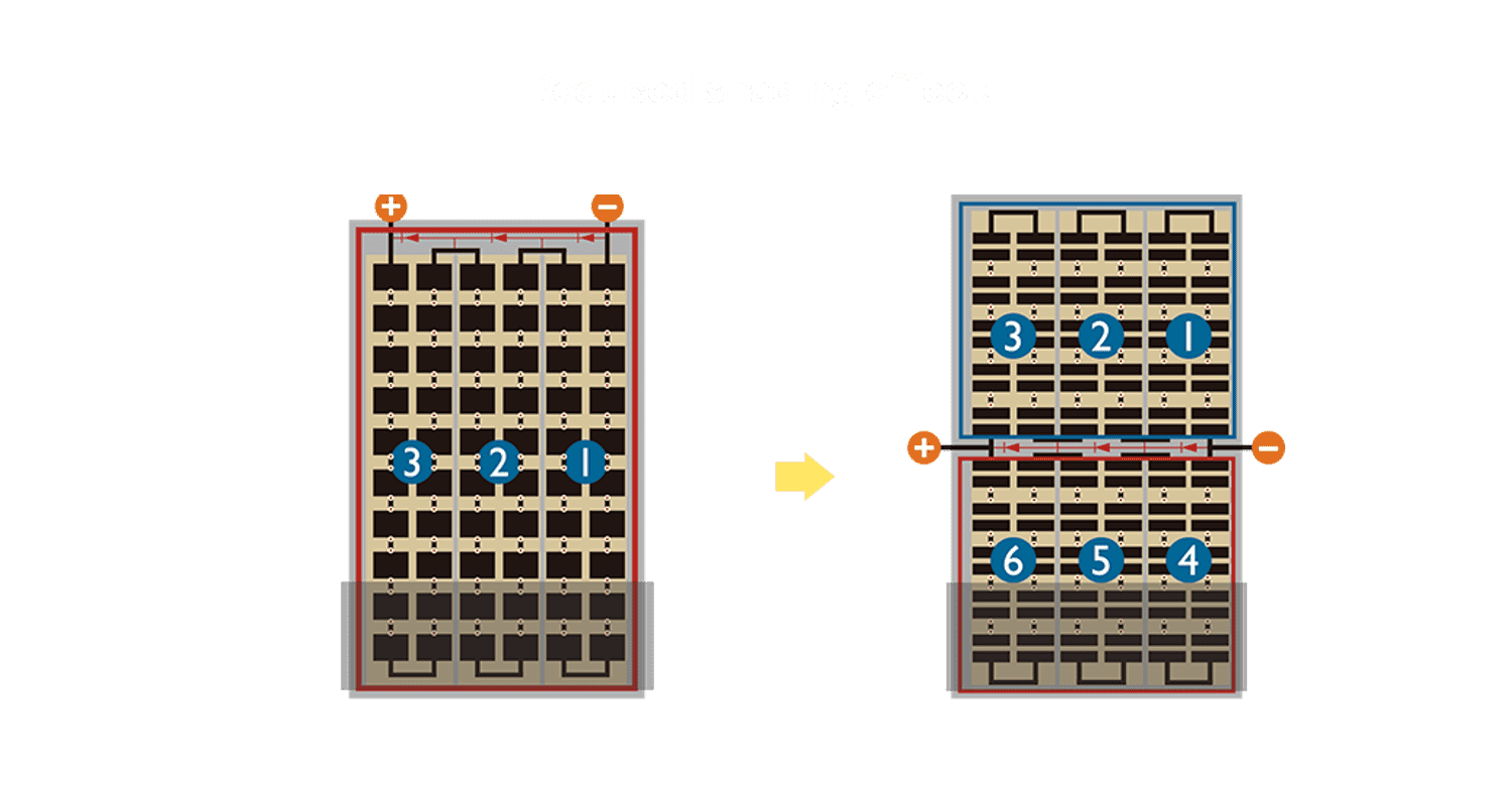 - 结合半切电池,,降低遮阴影响、、、、提升模组抗隐裂能力、、并减少电阻损耗,,,,进一步提升模组发电效能。。